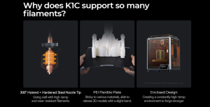 K1C je ustvarjen z mislijo na profesionalno uporabo. Poleg PLA, PETG in TPU namreč podpira tudi tehnične materiale, ojačane z ogljikovimi vlakni. Ti se uporabljajo za izdelavo mehansko odpornih in toplotno stabilnih delov. Zaprta tiskalna komora, robusten ekstruder in visoka temperatura šobe omogočajo tiskanje kompozitov z minimalnim popačenjem in odlično površinsko obdelavo. Poleg tega tiskalnik omogoča uporabo filamentov drugih proizvajalcev, kar zagotavlja popolno fleksibilnost.